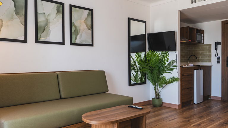 Equipped with 1 double bed, a single sofa bed, air conditioning, Tv, safety deposit box, bathroom with walk in shower and fully equipped Kitchenette, including microwave, kettle, toaster and fridge. All these studios have a balcony or terrace and overlook the pool terrace and pool bar.