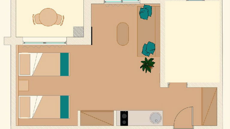 Equipped with 2 twin beds, a single sofa bed, air conditioning, Tv, safety deposit box, bathroom with walk in shower and fully equipped Kitchenette, including microwave, kettle, toaster and fridge. These studios are in our neighboring building, just 125m down the road and all have a balcony, and street view.
