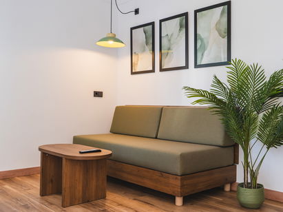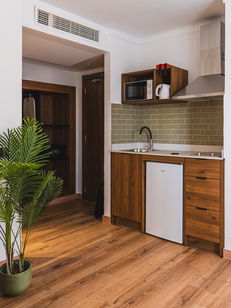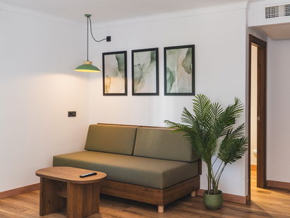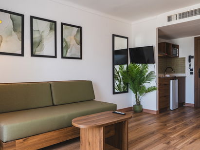 Equipado con 1 cama doble, un sofá cama individual, aire acondicionado, TV, caja fuerte, baño con ducha, cocina americana totalmente equipada, incluye microondas, hervidor de agua, tostadora y nevera. Todos estos estudios tienen balcón o terraza y tienen vistas a la zona de piscina.